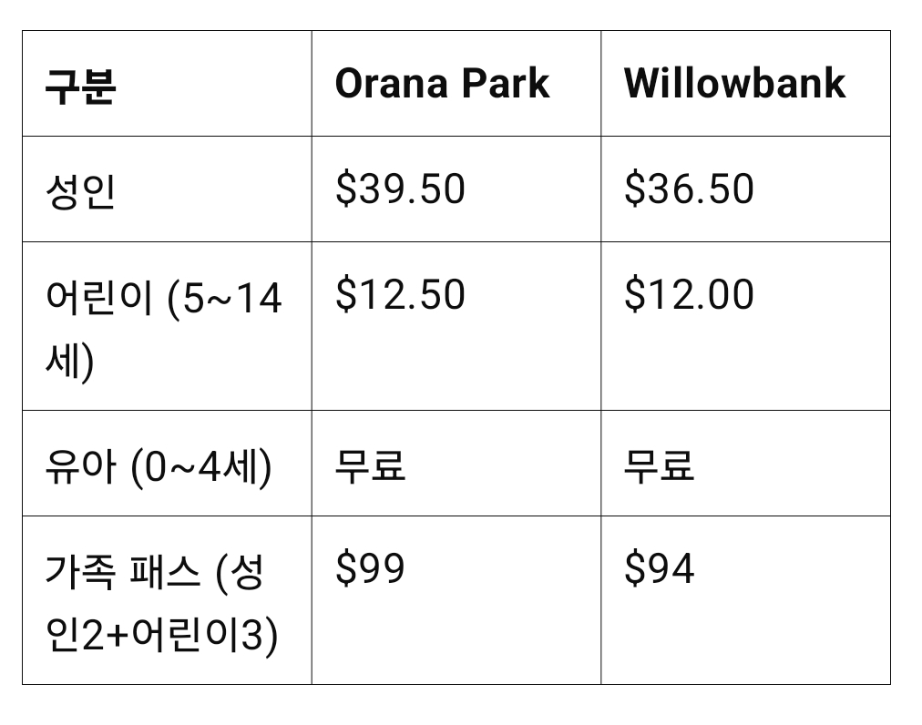 하지만, 공휴일이나 스쿨 할러데이 때 어린이 무료등 행사가 있을 수 있습니다. 저흰 이번 이스터 할러데이 행사로 오라나 파크에서 아이는 무료 입장했고요. 윌로우뱅크에선 엔터테인먼트북 쿠폰으로 어른 둘에 하나 요금으로 절약했습니다. 윌로우뱅크에선 동물 먹이 한 봉지에 ($4)이구요, 뱀장어 먹이($4)이렇게 따로 판매하고 있습니다. 오라나 파크에선 따로 먹이는 구입 안해도 됩니다.